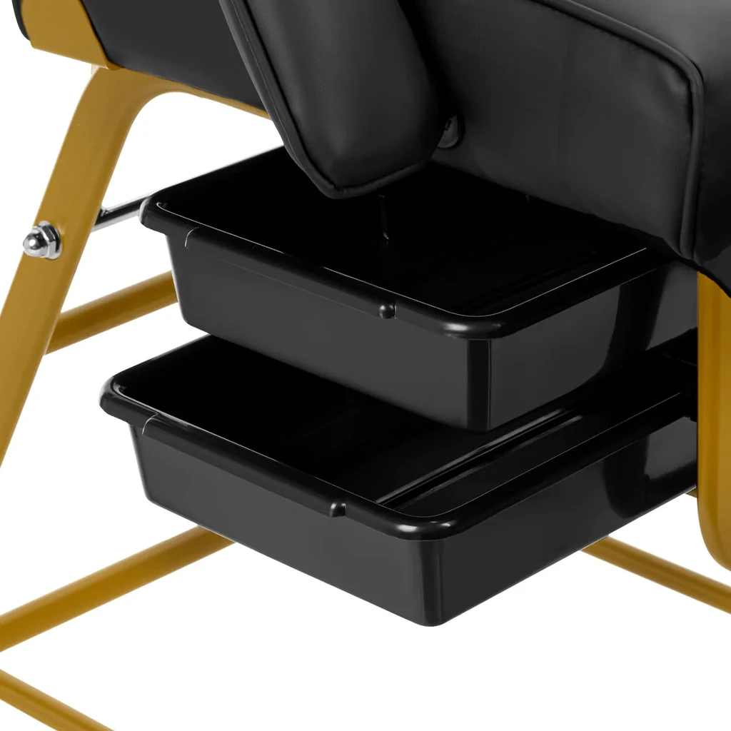 Behandelstoel 557G met twee lades is een praktisch stuk gereedschap dat het werk in veel gespecialiseerde salons, waaronder schoonheids-, massage- of tatoeagesalons, vergemakkelijkt. Het is geschikt voor mensen die op zoek zijn naar een eenvoudig, functioneel, maar toch onderscheidend cosmetisch meubelstuk. Uitschuifbare containers gemonteerd onder de stoel houden de belangrijkste gereedschappen en voorbereidingen altijd bij de hand.