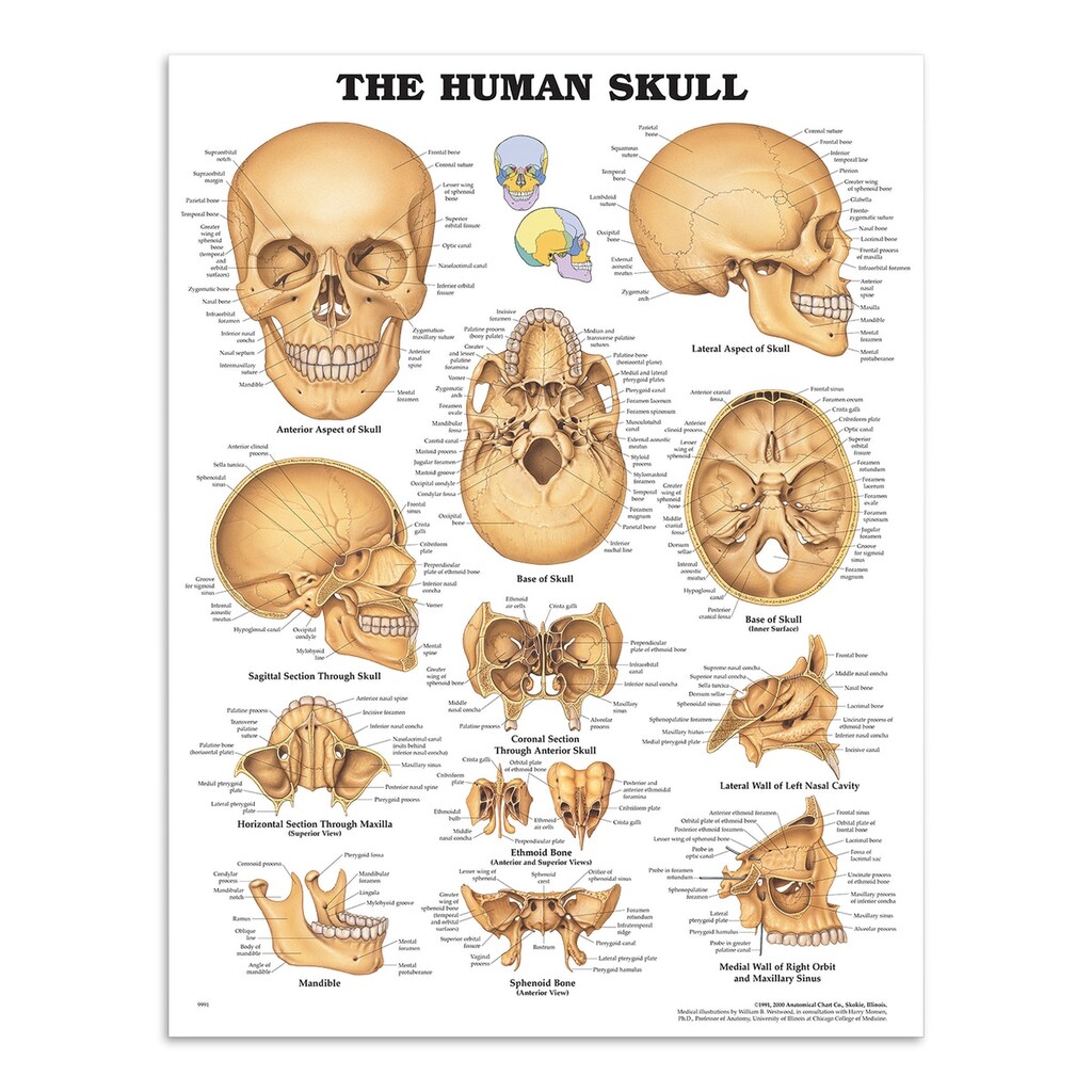 horizontale doorsnede door de bovenkaak, onderkaak, coronale doorsnede door het voorste deel van de schedel, zeefbeen, wiggenbeen, laterale wand van de rechter neusholte, mediale wand van de oogkas en maxillaire sinussen.