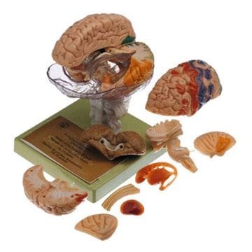 Levensgroot, gemaakt van SOMSO-Plast, naar Prof. Dr. J W Rohen, Afdeling Anatomie aan de Universiteit van Erlangen. Het model bestaat uit 15 afzonderlijke delen: hersenhelften (2), temporale en occipitale kwabben met limbisch systeem, cerebellum, …