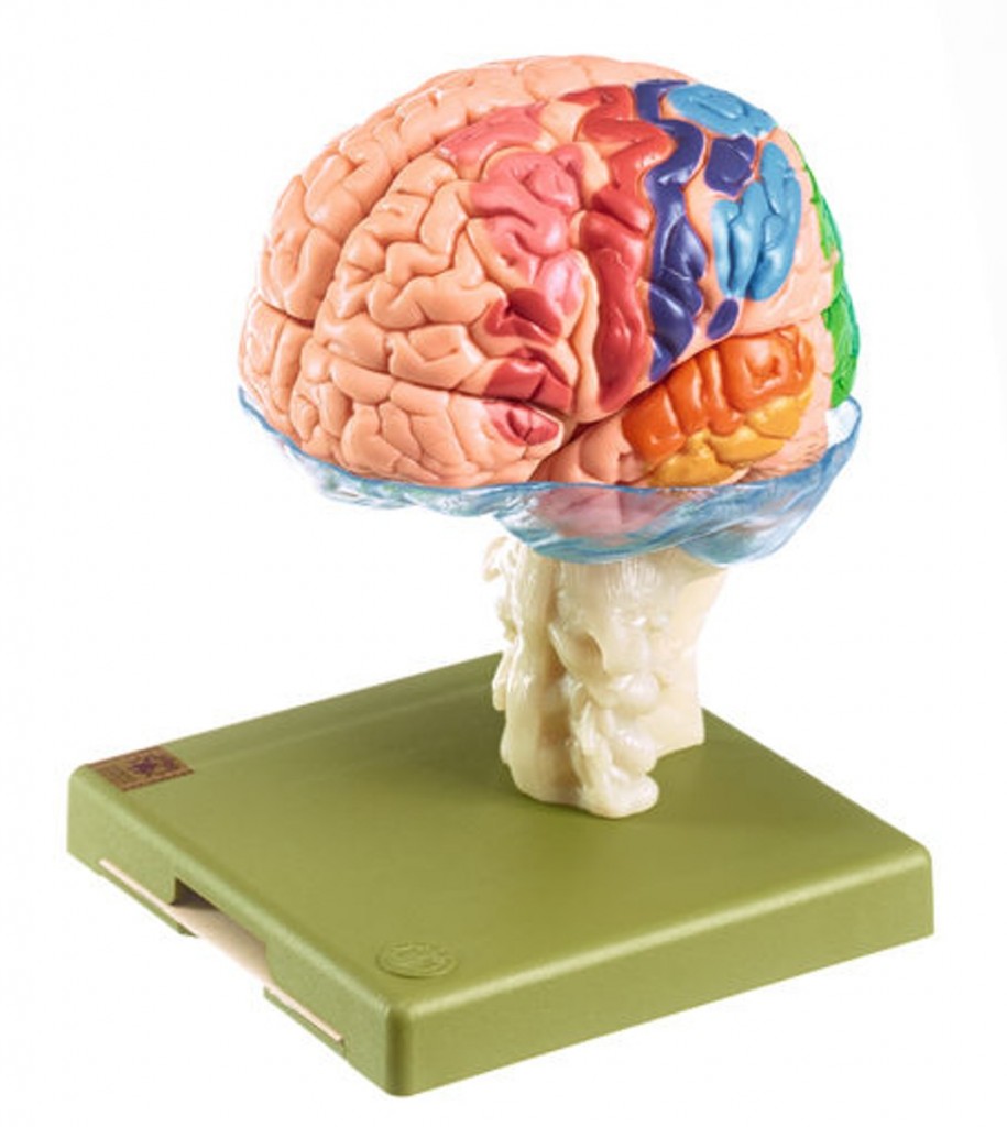 Levensgroot, gemaakt van SOMSO plast, naar Prof. Dr. J W Rohen, Afdeling Anatomie aan de Universiteit van Erlangen. Het model bestaat uit 15 afzonderlijke delen: hersenhelften (2), temporale en occipitale kwabben met limbisch systeem, kleine hersenen, frontale kwab, corpus callosum, hersenstam (2), corpus striatum, insula (2), nucleus lentiformis (links), capsula interna (rechts) en de hersenventrikels. De schedelbasis als basis.
