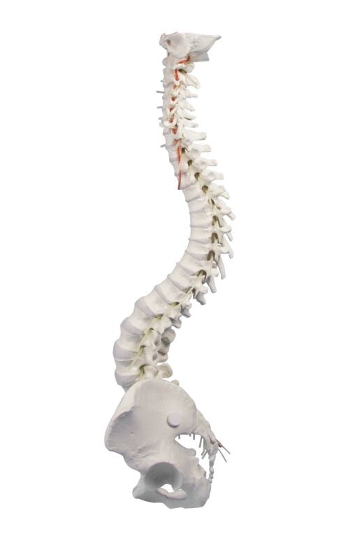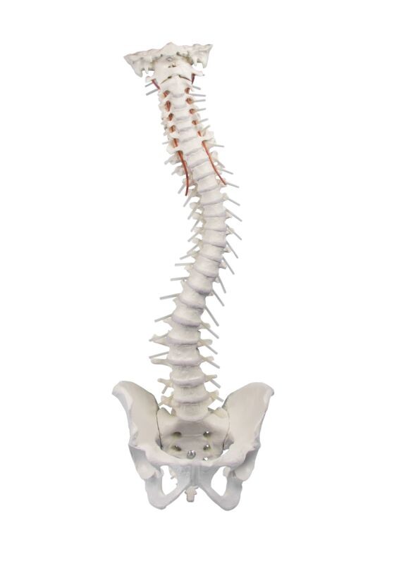 Hoogste kwaliteit natuurlijk afgietsel van een menselijke wervelkolom met verwijderbaar bekken. Het model is gemonteerd op een flexibele metalen spoel, waardoor de wervelkolom robuust en tegelijkertijd zeer beweeglijk is. De speciale flexibele tussenwervelschijven gedragen zich als natuurlijke tussenwervelschijven. Ook de ruggenmergzenuwen en de wervelslagader zijn afgebeeld. Zonder standaard.