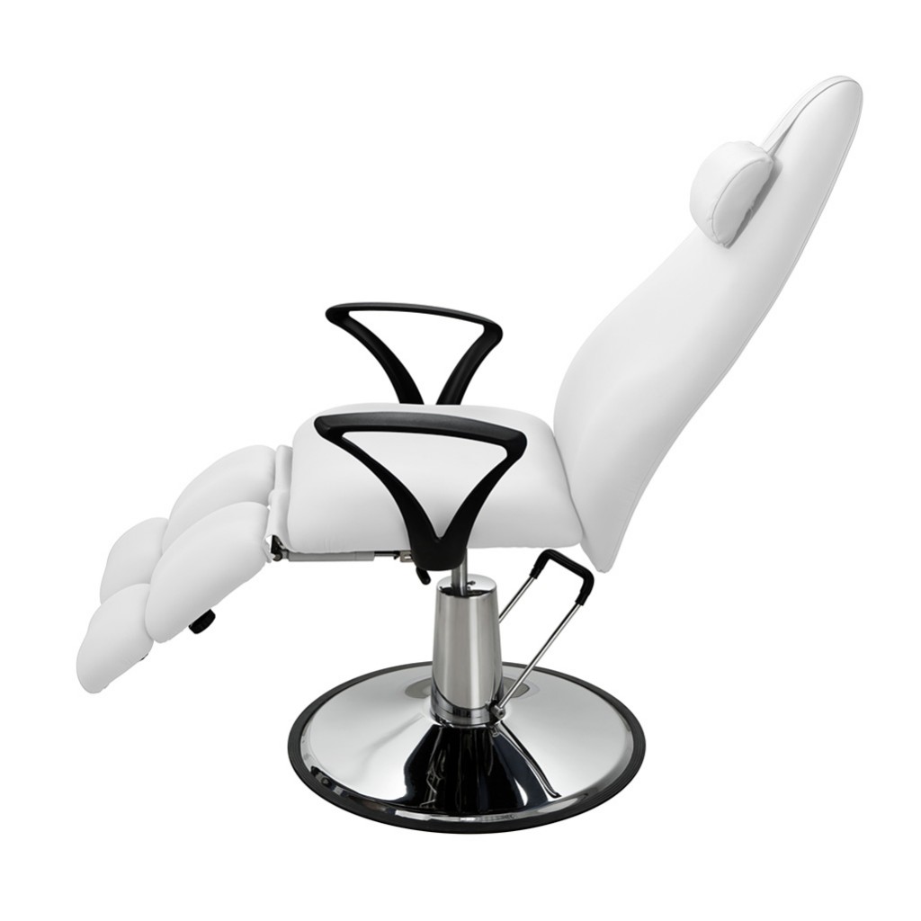 Draaibare pedicure stoel met zeer stabiele chromen voet. Verstelbare hoogteregeling door middel van een hydraulische pomp met rem. De rugleuning en de beensteun zijn traploos verstelbaar door middel van een gasveer. Hoogwaardige, witte, naadloze PVC-bekleding die eenvoudig te reinigen is. Afneembare hoofdsteun en kussen.